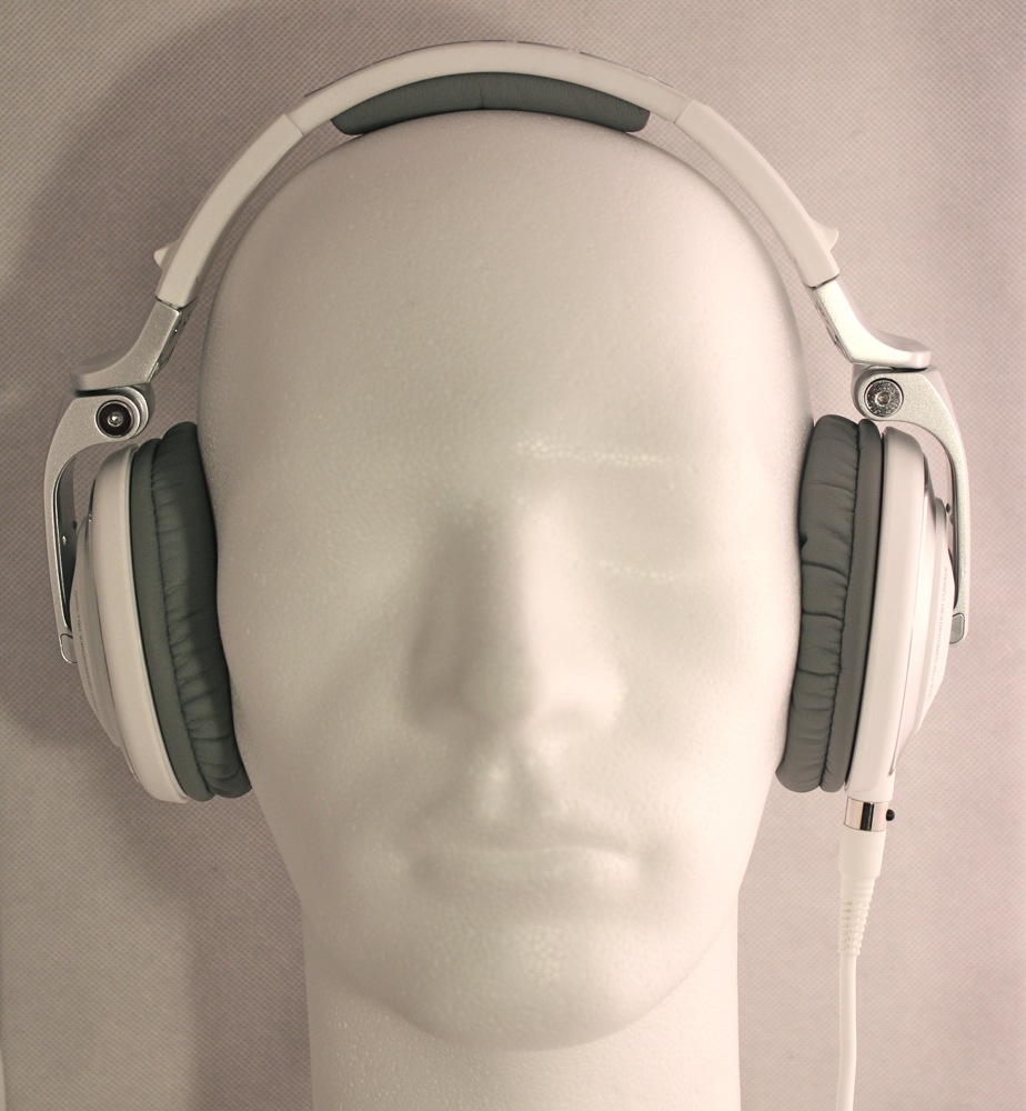 Der Bügel des HDJ-2000 besteht zum größten Teil aus Kunststoff. Das Kabel ist zu 100% verdeckt geführt und schaut an keiner Stelle raus. Die Ohrmuscheln sind auf 2 Gelenken gelagert, welche den Kopfhörer an den Kopf anschmiegen. Ein drittes Gelenk dient zum Einklappen des Kopfhörers, um ihn für den Transport besser verstaubar zu machen. Ein zusätzliches Gelenk zum wegklappen einer Kopfhörerseite ist nicht vorhanden. Die Ohrpolster sind aus Kunstleder und mit einem sehr weichen, anschmiegsamen Memoryschaum gefüttert. Ersatzpolster aus z.B. Velour, gibt es nicht im Lieferumfang. An der linken Kopfhörermuschel befindet sich ein Stereo-Mono-Schalter. Gleich daneben ist der 3-polige Kopfhörerkabelanschluss mit Arretierung. Das mitgelieferte 1,2m lange Spiralkabel lässt sich bis auf 3m strecken und besitzt einen schraubbaren Klinkenadapter. Trotz der 50mm Treiber macht der HDJ-2000 dank des Designs eine schlanke Linie, die sich sehen lassen kann.