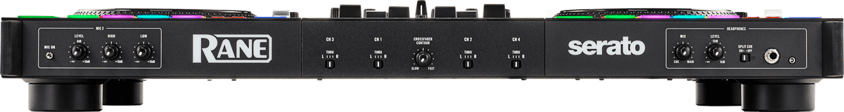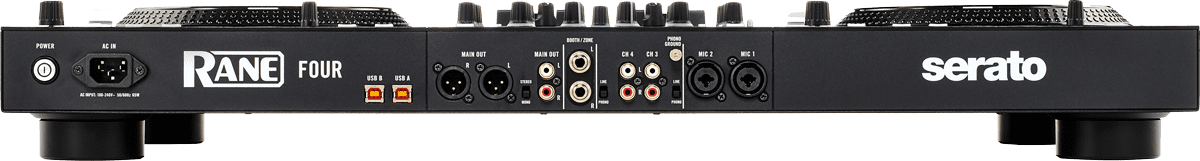 Rane hat den Four mit einer Reihe an Anschlüssen versehen, damit Erweiterungen durch Zuspieler und der Anschluss an eine PA möglich sind. Die Kanäle 3 und 4 sind hierzu mit umschaltbaren Line-/Phono-Eingängen ausgestattet, die sich für analoge Quellen oder eine DVS-Steuerung (mit optionaler DVS Expansion) nutzen lassen und für zwei Mikrofone gibt es Combo-Buchsen. Das Mastersignal verlässt das Gerät über XLR- und Cinch-Buchsen, für die Booth-Signale sind Klinkenbuchsen verbaut. Damit das Vorhören von Songs gelingt, trifft man an der Vorderseite auf zwei Kopfhörerausgänge, ausgeführt als Miniklinke und Klinke. Der Rane Four ist zudem mit zwei USB-B-Anschlüssen versehen, die eine Nutzung der Soundkarte erlauben und einen DJ-Wechsel oder eine DJ-Team-Nutzung vereinfachen.