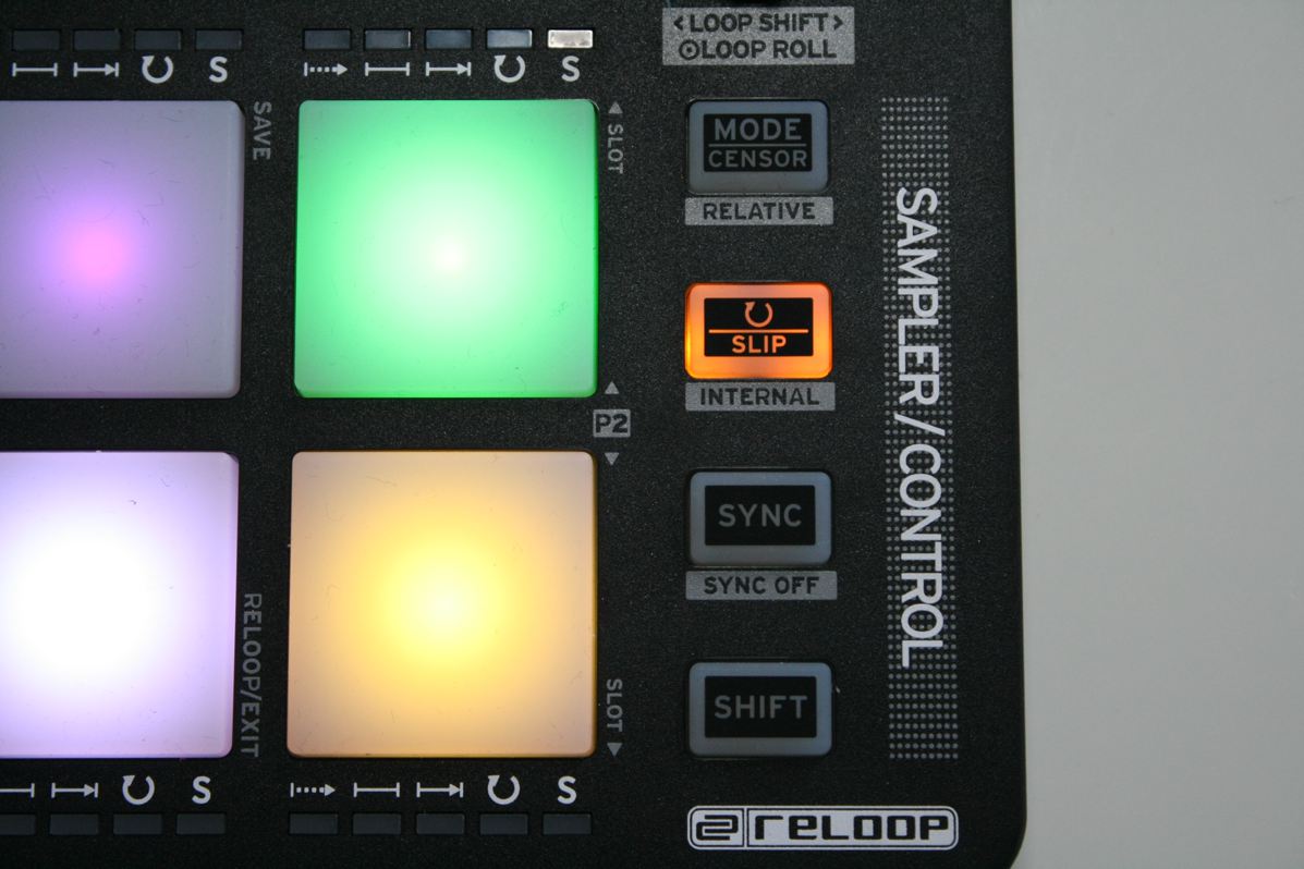 Die Funktionszuweisung der Pads findet mit Tasten statt, die direkt oberhalb der Pads angeordnet sind. Ein Encoder erlaubt die Navigation in der Songsammlung, das Laden von Songs und die Steuerung der Sampler-Lautstärke. Ein weiterer Encoder dient zum Setzen von Loops und für Loop Rolls.