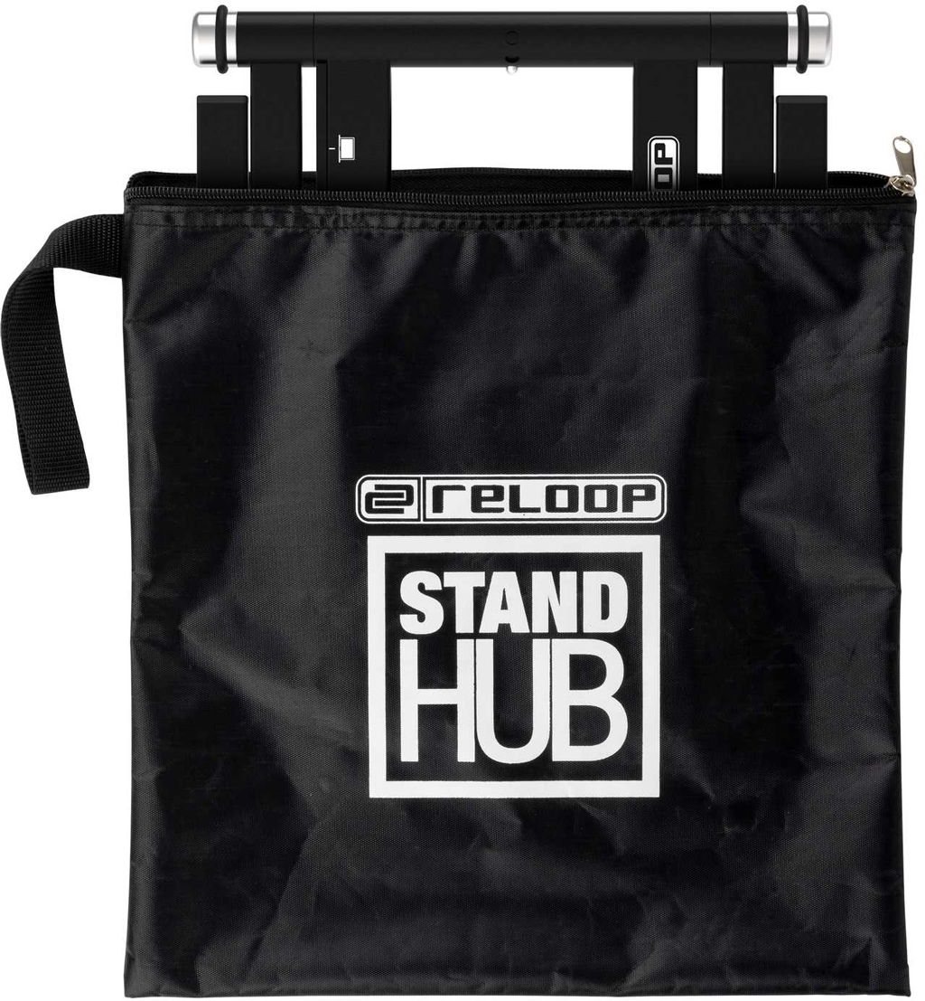 DJ-Spezialist Reloop erweitert seine Laptop-Ständerauswahl um das komplett aus Metall gefertigte Modell „Stand Hub“, das mattschwarz gehalten ist. Der Ständer wird mit einer Transporttasche ausgeliefert, misst im reisefertigen Zustand 30 x 29 x 2,8 cm und wiegt 1,4 Kilogramm. Neben der Tasche befinden sich gummierte Klebestreifen im Lieferumfang, die als Schutz vor Kratzern auf die Positionierarme geklebt werden, und zwei Sicherungspins.