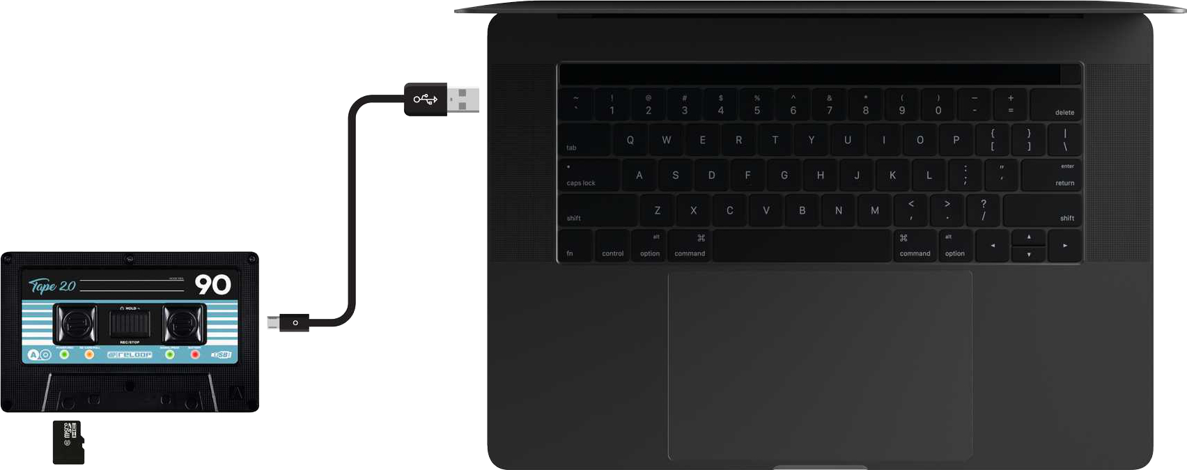 Tape 2 ist mit einer 3,5 mm Miniklinkenbuchse ausgestattet, die per Umschalter Line- oder Mikrofonsignale verarbeitet. Eine direkt daneben platzierte Thru-Buchse dient zum Durchschleifen der eingehenden Signale oder zur Pegelkontrolle per Kopfhörer. Die digitalisierte Musik lässt sich bequem auf einer MircoSD-Karte mit einer Kapazität von bis zu 128 GB speichern, wobei man diese als unkomprimierte WAV- oder datenreduzierte MP3-Dateien (320 kbps) festhalten kann. Die Speicherkarten rasten mit einem hörbaren „Klick“ sicher im Gehäuse ein und sind so vor einem unbeabsichtigten Entfernen geschützt.