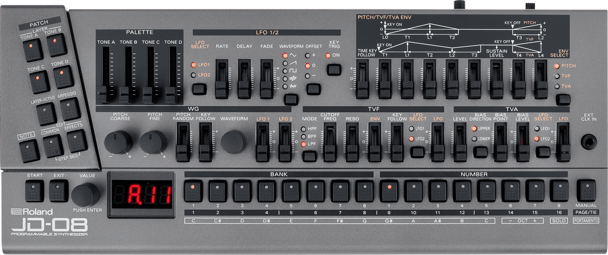 Rolands JD-08 kombiniert pro Patch vier Layer bzw. Tones zu einem Gesamtklang. Ähnlich wie bei Wavetablesynths dienen kurze PCM-Samples als Klangerzeuger, wobei jeder Tone eine eigene Wellenform spielen kann. Das Lautstärkeverhältnis dieser Tones lässt sich über die vier Palette-Slider regeln und per LFO und Co. modulieren. Anhand der angeschrägten Taster oben links am Gerät wird das aktive Layer angezeigt bzw. ausgewählt und kann dann mit den vielen Bedienelementen des JD-08 justiert werden.