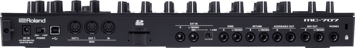 Die Anschlüsse von Rolands MC-707 befinden sich allesamt auf der Rückseite des Instruments und umfassen einen Stereo-Mix-Out in Form von zwei Klinkenbuchsen, einen Stereo-Kopfhörerausgang, ebenfalls als 6,35mm-Klinke, MIDI-In, -Out1 und -Out2 nach fünfpol-DIN sowie einen USB-B-Port für beispielsweise Firmwareupdates. Per USB kann MC-707 aber auch als Audio/MIDI-Interface dienen und Multitrack-Aufnahmen bewerkstelligen.