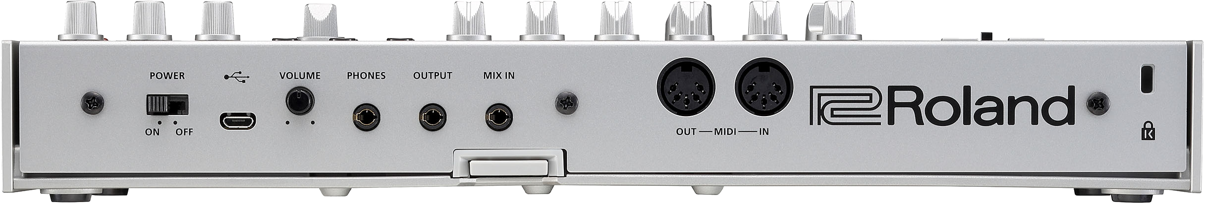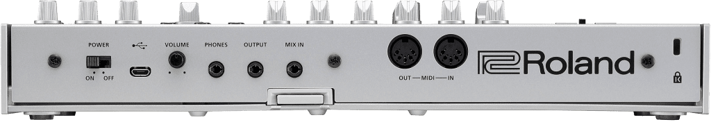 Komischerweise wurde der Lautstärkeregler auch hier verbaut. Zusätzlich zur MIDI-fähigen Micro-USB-Buchse gibt es noch MIDI In und Out nach DIN-Norm, die restlichen Anschlüsse befinden sich an der Oberseite des Geräts. Die dortige Minipatchbay besteht aus einem Trig-In sowie Trig-Outs für Accent, Hi-Tom, Lo-Tom, Kick und Snare.