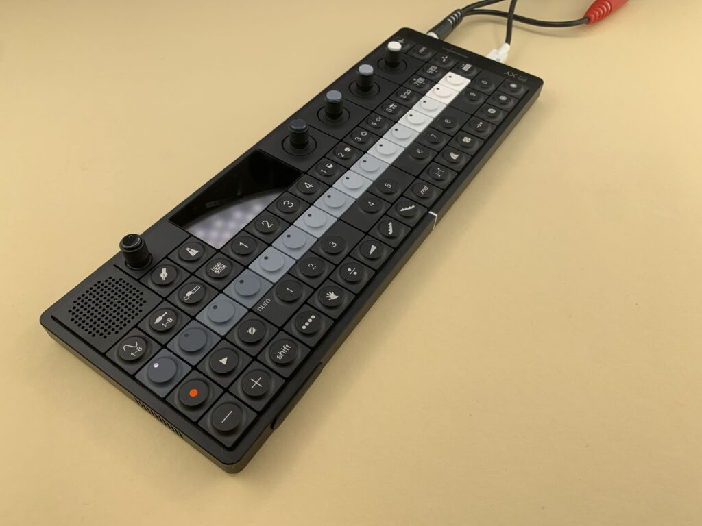 Weiter oben wurde salopp behauptet, dass Parameterlocks bei Teenage Engineering Step Components heißen. Das stimmt nicht so ganz – alle Parameter, die über die vier Encoder erreichbar sind, lassen sich in gewohnter Weise bei gehaltenem Step-Taster auf bestimmte Sequenzer-Steps locken. Die Step Components sind eine Sammlung an Parametern, die nicht in den Modulen zu finden sind. Hier gibt es beispielsweise Velocity, Multitrigger oder Trig Conditions. Alle Step Components sind in Form eines kleinen Symbols auf den Natural Keys erkennbar, vorausgesetzt man checkt die Zuordnung. Cool ist, dass die jeweiligen Values der Step Components genau wie bei der Sequenzer-Scale direkt über die nummerierten Accidentals eingegeben werden.