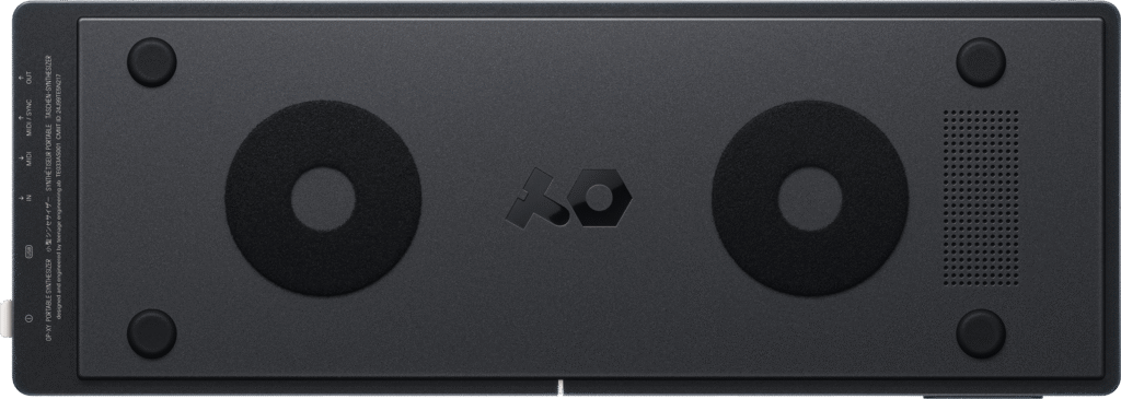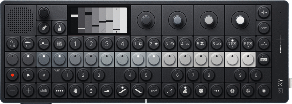 Haptisch besticht OP-XY mit dem Teenage Engineering typischen Cherry-Keyboard-Feel: Die Taster sind angenehm leicht zu drücken und geben spürbar nach. Abgesehen vom Master-Volume-Poti handelt es sich bei den 4 Main-Reglern um Endlos-Encoder, ideal für multifunktionale Parametersteuerung. Die Encoder sind Velocity-empfindlich und erlauben schnellen Zugang auf Extra-Features mittels Push-Funktion. Dank der Gummi-Sleeves bieten die Knobs angenehmen Grip und punkten mit ausreichend Drehwiderstand für präzises Handling. Das 480 x 220 IPS TFT Display sorgt für den Überblick und visualisiert die zahlreichen Features des OP-XY mit schönen Grafiken – TE-Vibes only. Passend zum Black-and-White-Look des OP-XY ist auch die Anzeige in Schwarz-Weiß gehalten.