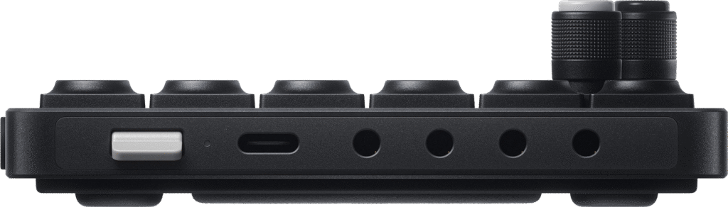 Die Anschlusssektion des OP-XY ist relativ überschaubar gehalten und besteht aus Audioausgang, Line-In sowie MIDI-In und -Out, wobei sich letzterer auch als Sync- oder CV-Ausgang eignet. Cool ist, dass der Stereo-Line-Out mit Headset-Mikros kompatibel ist. Aufgrund der geringen Größe der Groovebox handelt es sich bei den Anschlüssen um 3,5-mm-Klinkenbuchsen – entsprechende MIDI-Adapter sind nicht im Lieferumfang enthalten. Ein USB-C-Slot dient als MIDI-Alternative, Stromzufuhr, zum Installieren von Firmware-Updates oder als weitere Audio-Schnittstelle. Anders ausgedrückt: OP-XY ist USB-C Audio/MIDI Host und Device. Achso, MIDI via Bluetooth gibt es auch noch.