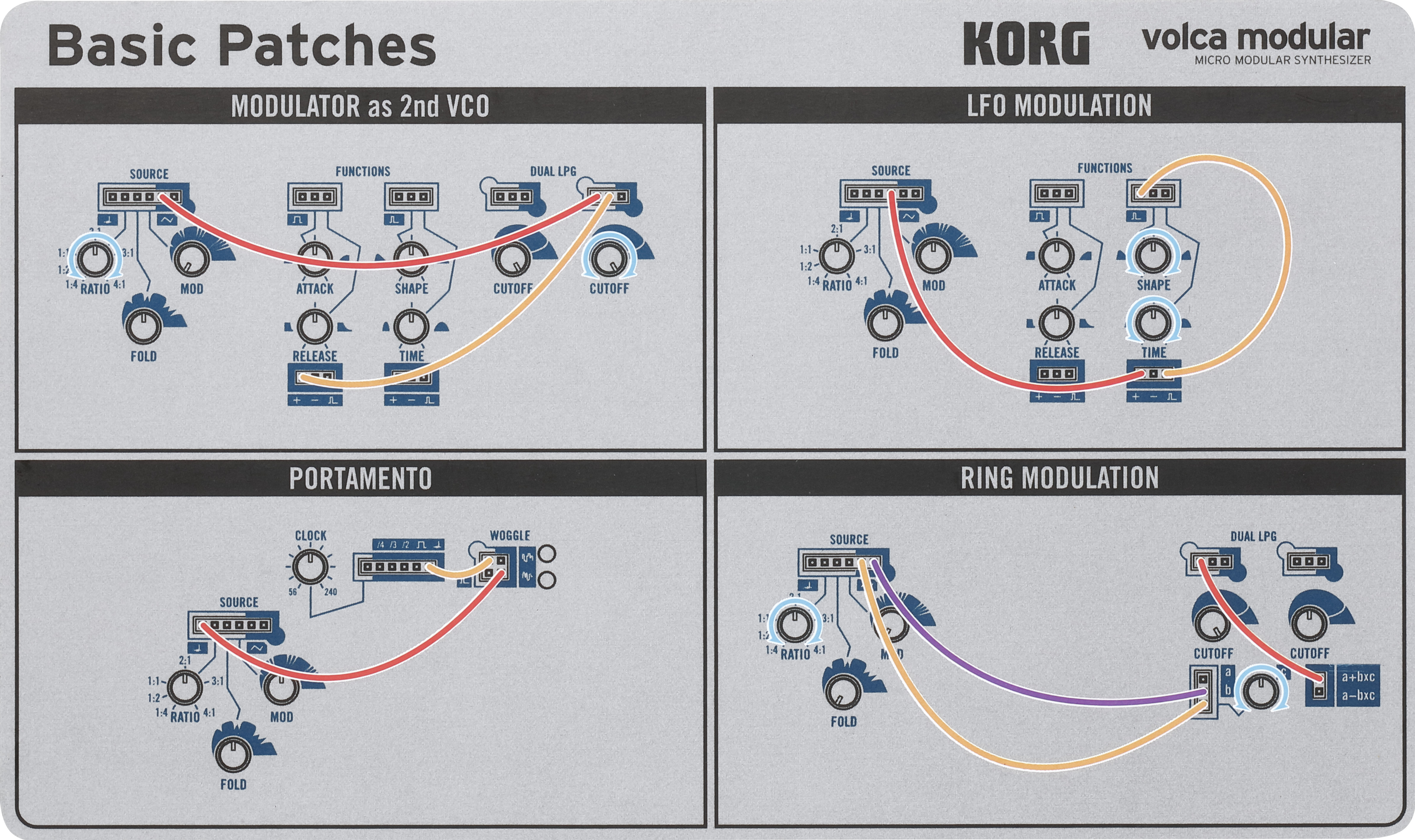 Bei dem Korg handelt es sich übrigens um einen semi-modularen Synthesizer. Das heißt, dass das Gerät intern vorverdrahtet ist und auch ohne gesteckte Verbindungen Klänge erzeugt. Somit kann man sich als Neuling erst einmal mit dem grundlegenden Klang vertraut machen, bevor man sich in kompliziertere Gefilde wagt. Des Weiteren kommt der Modular mit einem kleinen Sheet, auf dem die Funktionen der einzelnen Module und ein paar grundlegende Patches aufgedruckt sind. Auch die enthaltene Bedienungsanleitung mit weiteren Sounds zum Nachbasteln erleichtert den Einstieg in die Modular Welt.