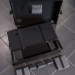 Neben dem S8 passt auch ein Laptop ins Case. Eigens hierfür ist eine Laptopschiene integriert. Im Live-Einsatz finden hier Geräte bis 17" platz. Beim Transport wird der Laptop mit Klettband gesichert und die Laptopschiene wiederum schützt den S8 von oben. Je nach Größe des Laptop passt Live auch noch ein bisschen Kleinkram auf das Tray. Eine extra Kabelöffnung für das Netzteil verhindert den üblichen Kabelwirrwarr.