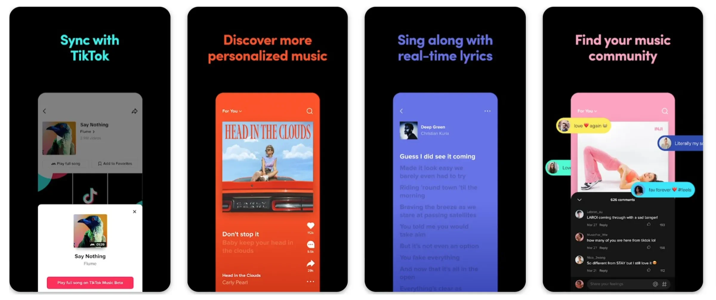 Im Vergleich zu Spotify ist der Community-Gedanke viel größer. Songs können kommentiert und diskutiert werden. Außerdem ist es möglich, dass Nutzer:innen ihre Lieblingstitel und -künstler:innen von TikTok Music mit ihrer Community auf dem Hauptdienst TikTok teilen. Zusätzlich gibt es Funktionen, die es den Nutzer:innen ermöglichen, ihre Musikbibliothek zu importieren, Songs herunterzuladen, um sie offline zu hören, gemeinsame Wiedergabelisten zu erstellen, Liedtexte in Echtzeit anzuzeigen und Titel durch die Suche nach ihren Texten zu finden. Darüber hinaus enthält der Dienst eine Shazam-ähnliche Funktion, um Lieder zu identifizieren.