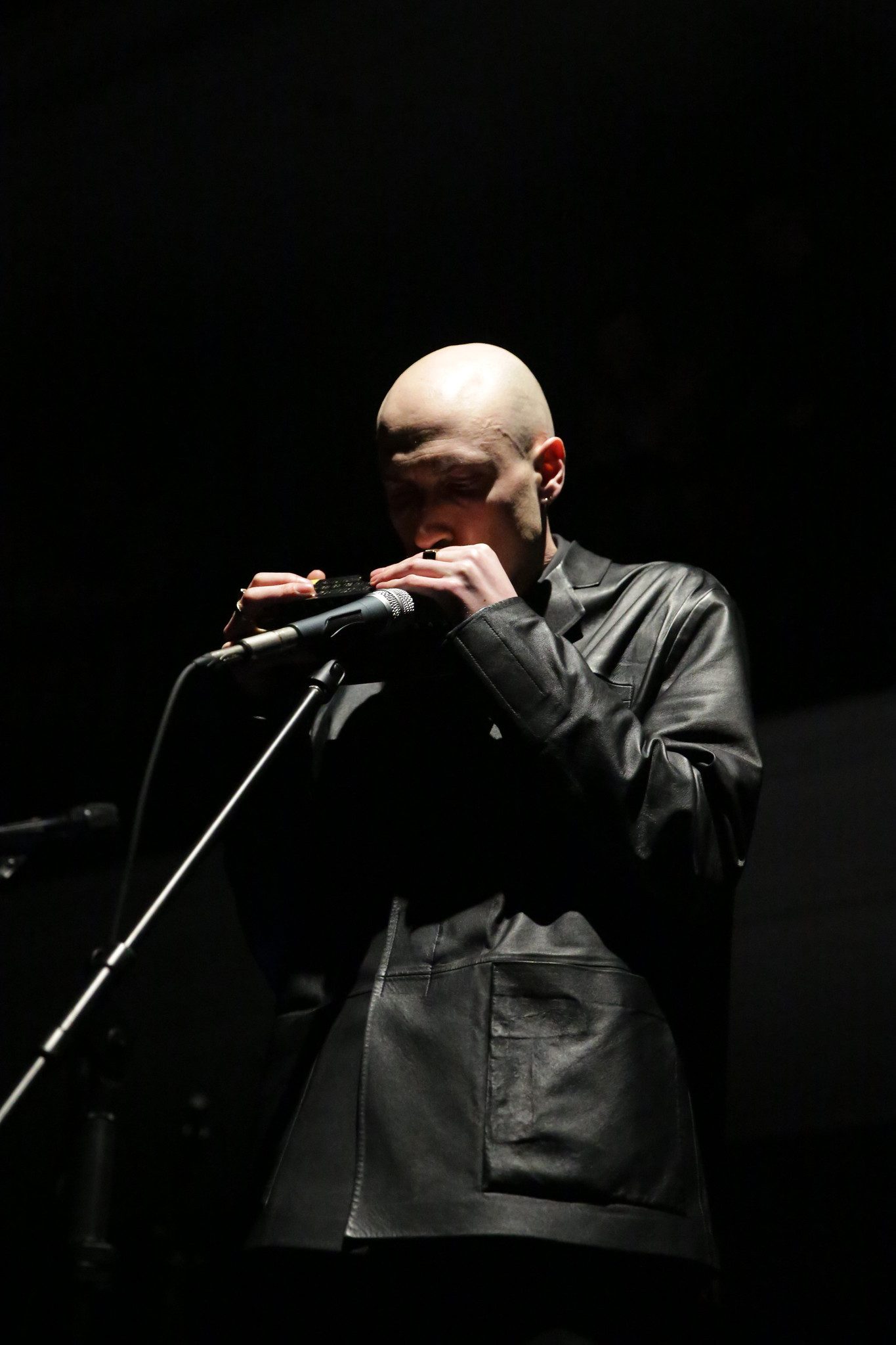 Nach einer kurzen Pause stellt der Brite Daniel Blumberg sein neues Album GUT vor, das im Mai erscheinen wird. Wer Blumbergs Vorgänger kennt, erwartet melancholischen Singer-Songwriter-Sound – aber von dem hat er sich auf GUT verabschiedet. Der Fokus liegt zwar noch immer auf seinem glasklaren Gesang, aber der geht Hand in Hand mit koordiniertem Chaos, das der schwarz gekleidete, hagere Mensch mit seiner Loopstation und einer wohl selbstgebauten, überdimensionierten Bass-Mundharmonika erzeugt.