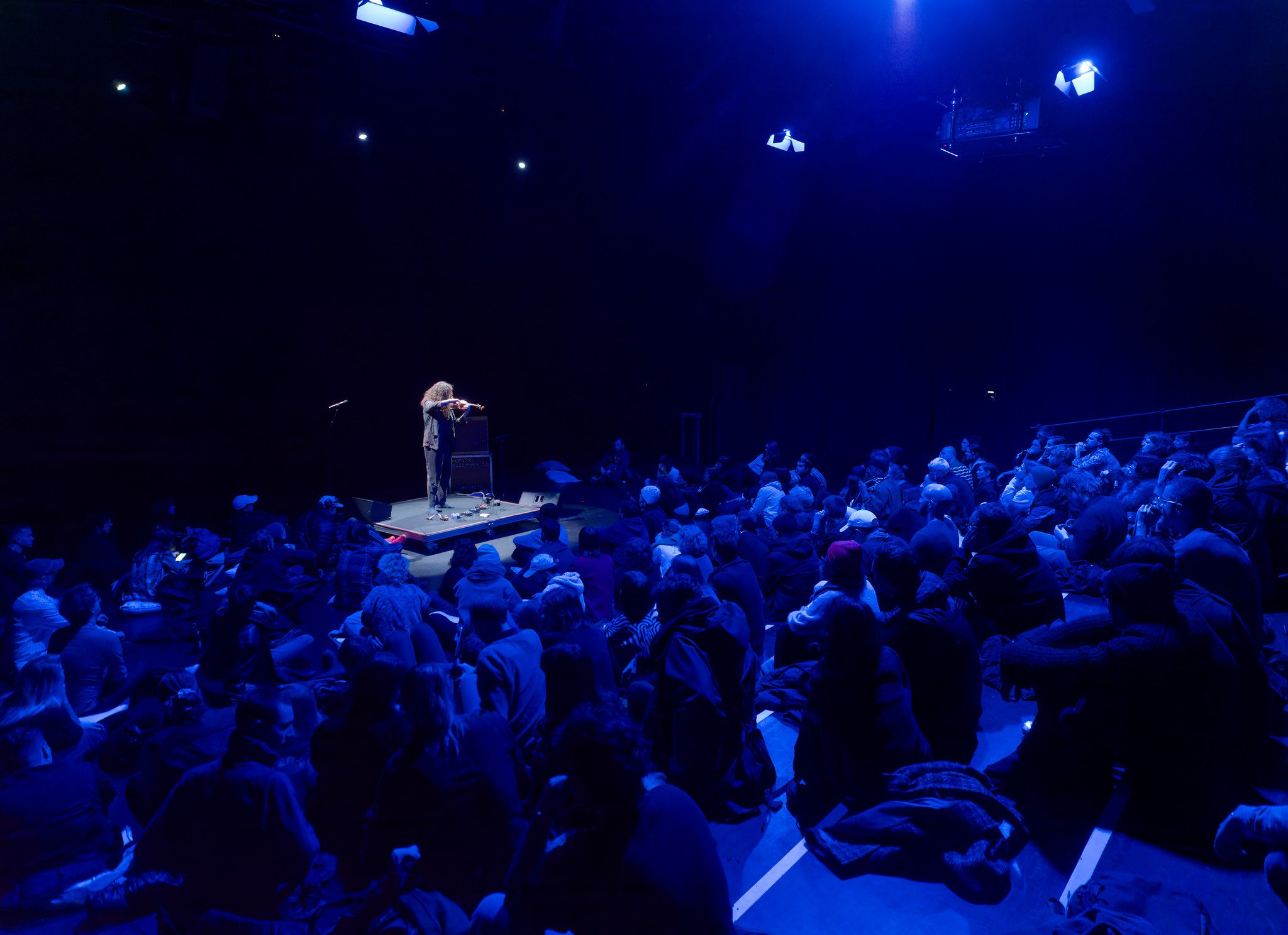 Der Abend beginnt entspannt im HAU2. Dort spielen in theatraler Kulisse Gibrana Cervantes aus Mexiko und die UK-Künstlerin Keeley Forsyth. Cervantes braucht auf der Bühne nichts als ihre Geige und ein paar Effektgeräte. Ihren Metal-Background hört man den Melodien zunächst nicht an, doch spätestens im zweiten Teil des intensiven und melancholischen Stücks wird Cervantes energischer, die langen, lockigen Haare fallen auf das Griffbrett ihrer Geige und tragen zum verzerrten, repetitiven Sound bei. Pause.
