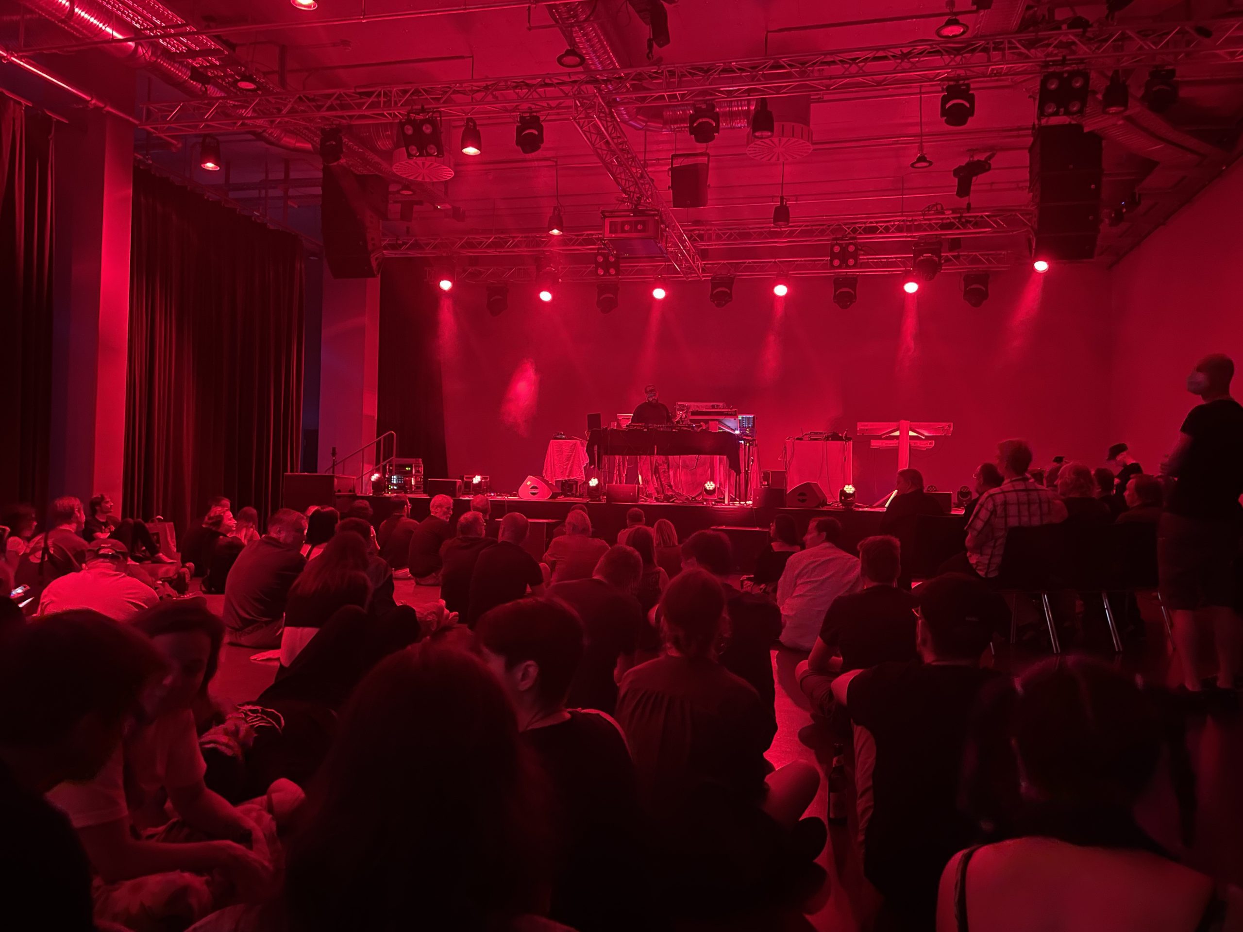 Los ging es dann am Freitag, den 12.8. im Silent Green, einem ehemaligen Krematorium. Bei bestem Sommerwetter steht man noch draußen auf dem frisch gemähten Rasen, bestellt Kräuterlimo, saugt den lauen Vibe der von rotem Backstein geprägten Location ein und wartet, dass der Türsteher mit ausgeprägter Berliner Schnauze sagt, dass es losgeht. Zeit also, die Gäst:innen zu beobachten: Wer geht wohl zu einem Eröffnungskonzert mit Headliner Tangerine Dream und Support von Rosa Anschütz? Dass zwischen den beiden Acts Generationen liegen, merkt man direkt: Auf der einen Seite wartet ein Mix aus bunt zusammengewürfelten Mitte-Zwanzigern auf den Einlass, auf der anderen Männer mittleren Alters, die alle der Facebook-Gruppe „Synthesizer Forum“ entsprungen zu sein scheinen. Manchmal mit Frau, manchmal mit Kindern, fast immer im schwarzen T-Shirt mit entweder Vintage-Synthesizer- oder wahlweise Tangerine-Dream-2004-Tour-Aufdruck. Das kann witzig werden, denke ich, schnappe mir vorsorglich noch ein Bier und gehe rein.