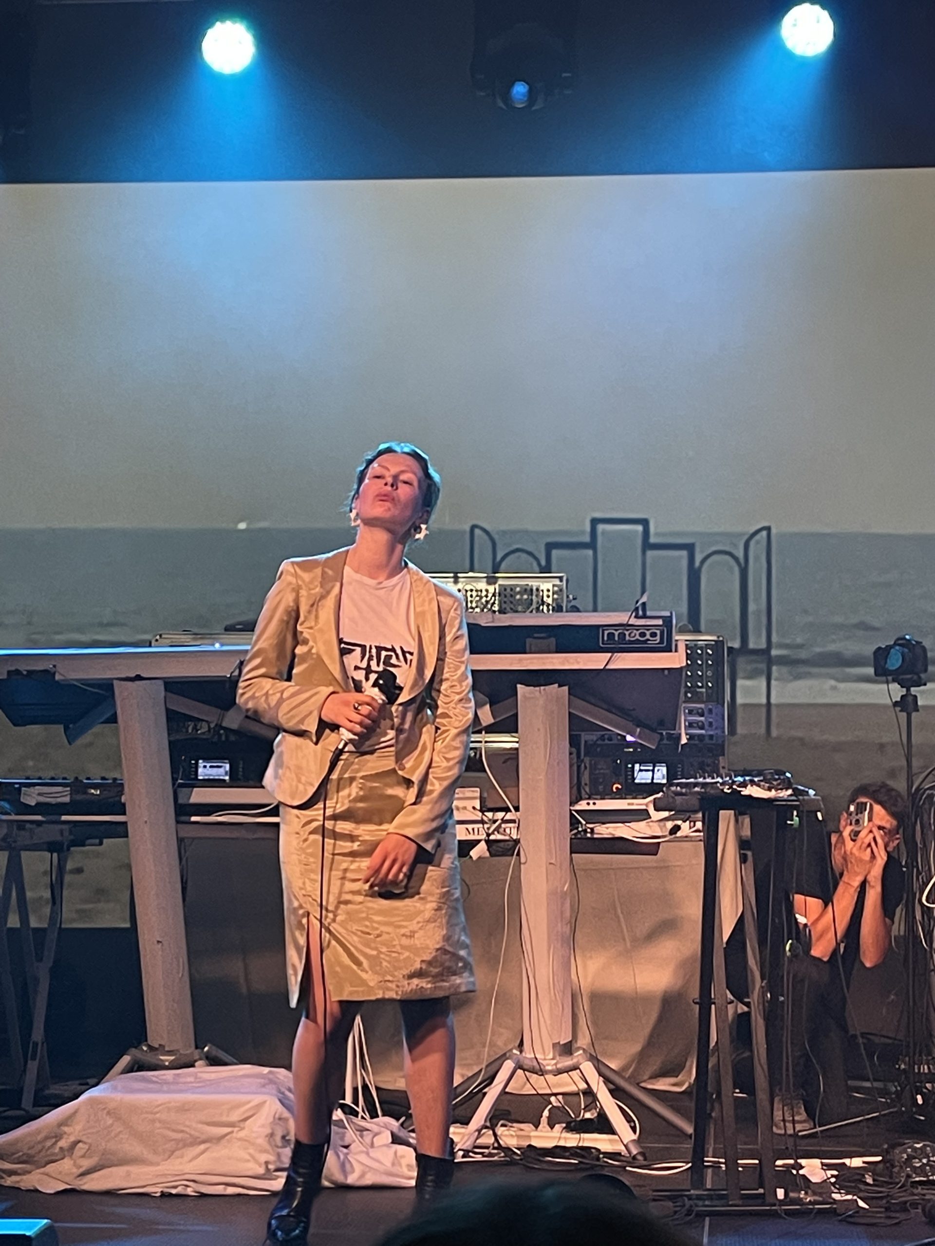 Rosa Anschütz fängt an und die Leute zögern noch, ob sie direkt aufstehen sollen, wie es vereinzelte vormachen. Ihr voller Sound und die neue Energie im Raum geben dann aber den entscheidenden Ruck. Ich kann ohne zu übertreiben sagen, dass Anschütz mich an diesem Abend komplett in ihren Bann gezogen hat. Ihre Mischung aus kühl-distanziertem Kokettieren und intimen, insbesondere über ihre Vocals kommunizierten Themen erzeugen ein ganz eigenes Spannungsfeld: Mal bekümmernd, mal freischlagend. Ich fühle mich nah dran und dabei.