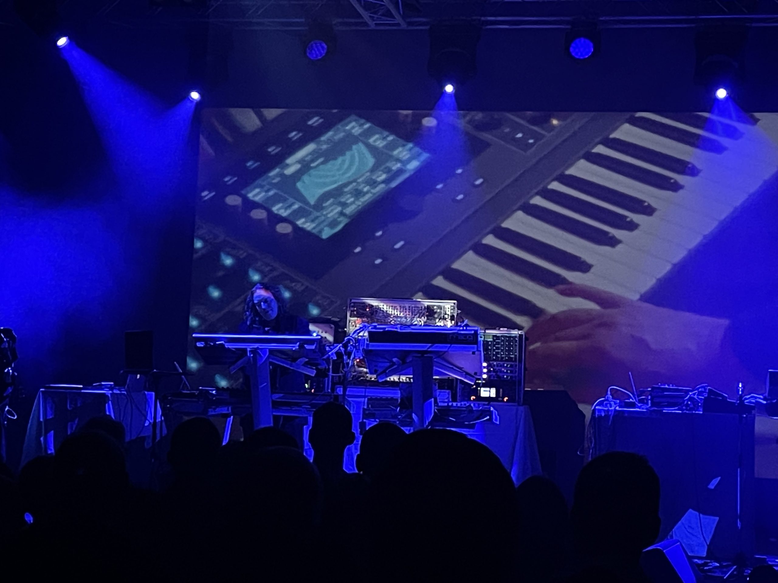 Am Hauptprogrammpunkt des Abends angekommen fällt einem auf, wie einladend diese ganze Veranstaltung schon seit Beginn ist: Lead-Musiker Quaeschning heißt maximal herzlich willkommen zu Tangerine Dream und nimmt mit seiner Art den Raum spürbar warm ein. Er und das Publikum grinsen sich gegenseitig an, man kennt sich, man ist zusammen verschworen, beide Parteien wissen, was da jetzt kommen wird. Die Zuschauer:innen wogen nun noch mehr, jede:r steht und man bekommt, worauf man gewartet hat: Modularsystem und die ganz großen Instrumente auf der Bühne, heftige Bladerunner-Vibes und endzeitlich-psychedelische Synthesizer-Solos in Spielart von E-Gitarren.