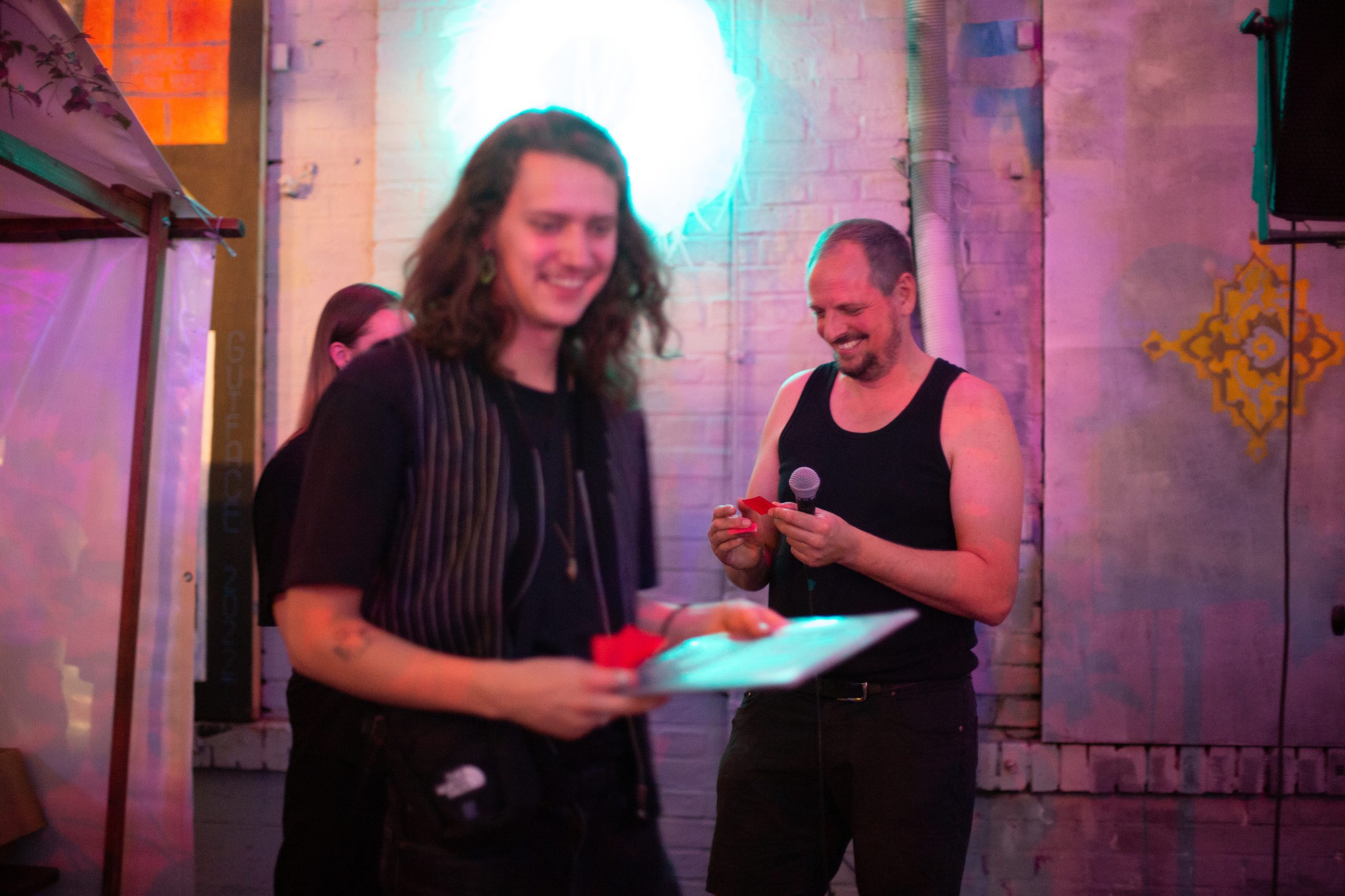 Nach ein bis zwei Runden zieht es mich, vorbei an dem kleinen Tattoo-Laden, in dem gerade großflächig Haut bemalt wird, zur neapolitanischen Pizza. Etwas Stärkung ist notwendig, denn gleich folgt das Highlight des Abends. Vor der kleinen improvisierten Bühne bildet sich eine große Traube und es liegt ein Kribbeln in der Luft. Die Tombola beginnt und alle hoffen, etwas zu gewinnen. Verlost wird allerlei Equipment von Kopfhörern über Ableton Lizenzen bis hin zu Synthesizern. Zahl um Zahl wird gezogen und vielleicht ist meine ja die nächste? Das Schöne an so einer Tombola ist ja, dass man sich kurz ärgern kann, die unmittelbare Freude der Gewinnenden neben dir lässt es dann schlussendlich doch zu einem großen Spaß für alle Beteiligten werden. Der Hauptgewinn, ein Korg Modwave, geht dieses Jahr an die Nummer 58. Mit dem Preis über dem Kopf erhoben, geht es stolz zu den Freund:innen rüber und während man sich beglückwünscht, kommt die Gruppe schnell zu dem Entschluss, dass man demnächst wieder mehr Musik machen muss.