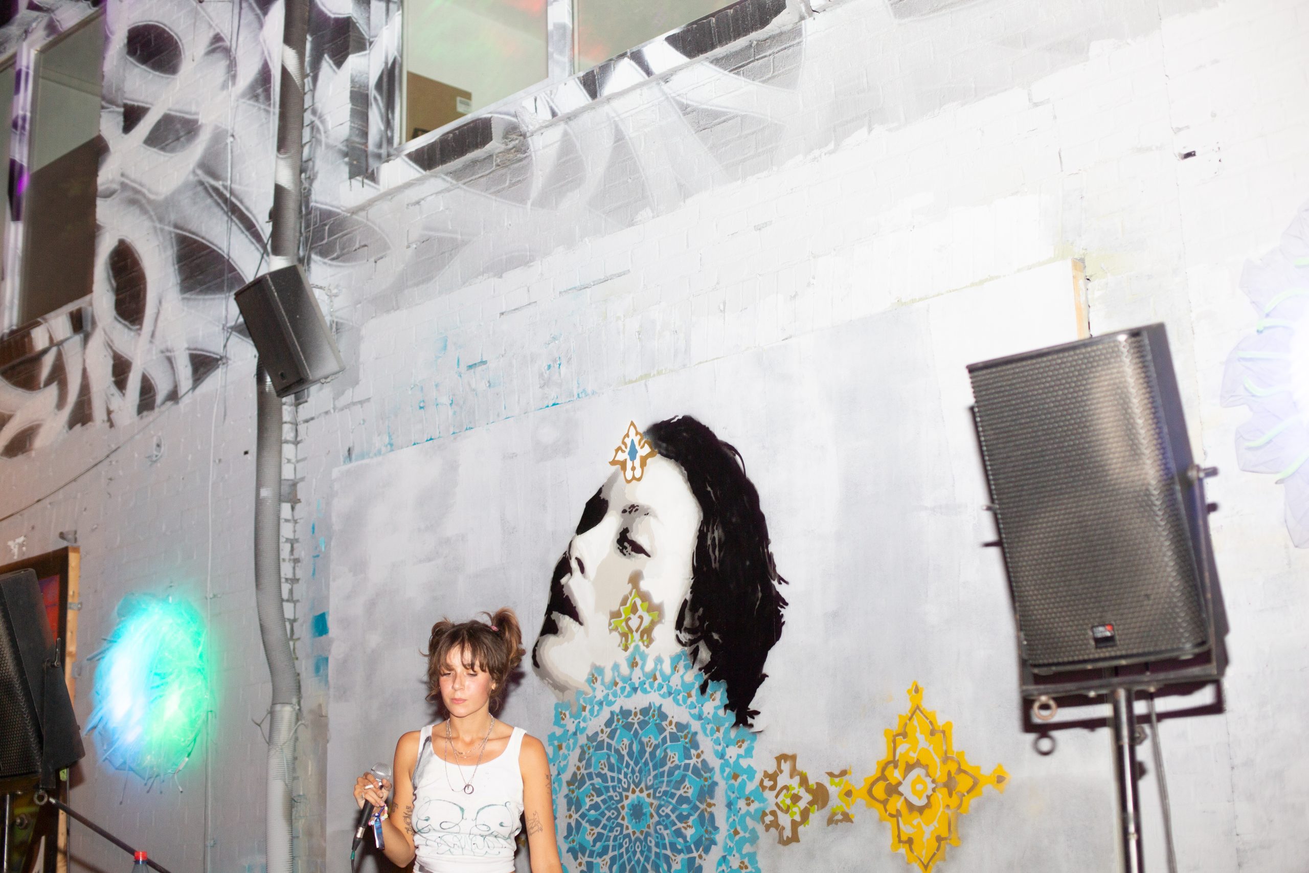Die beginnt jetzt auch im Urban Spree, denn der Label-Markt ist jetzt beendet und der musikalische Teil des Abends wird eingeleitet. Bevor es drinnen mit dem Raiders Showcase losgeht, macht 3LNA mit einem kleinen Konzert den Abschluss – oder ist es der Beginn? Mit jedem Lied, das die Berlinerin spielt, sieht man, wie das Lächeln der Menschen vor der Bühne größer wird. Die Mischung aus naiven NDW-Texten, minimalistischem Elektro-Pop und dem hauchigen Vibe von 3LNAs Stimme, zieht mich sofort in den Bann und ein Ohrwurm nach dem anderen ringt in meinem Kopf um die Oberhand. Während man so verzaubert dasitzt, beginnt dann auch noch irgendwo ein Feuerwerk und man kommt sich vor wie in einem absurden Indie-Film.