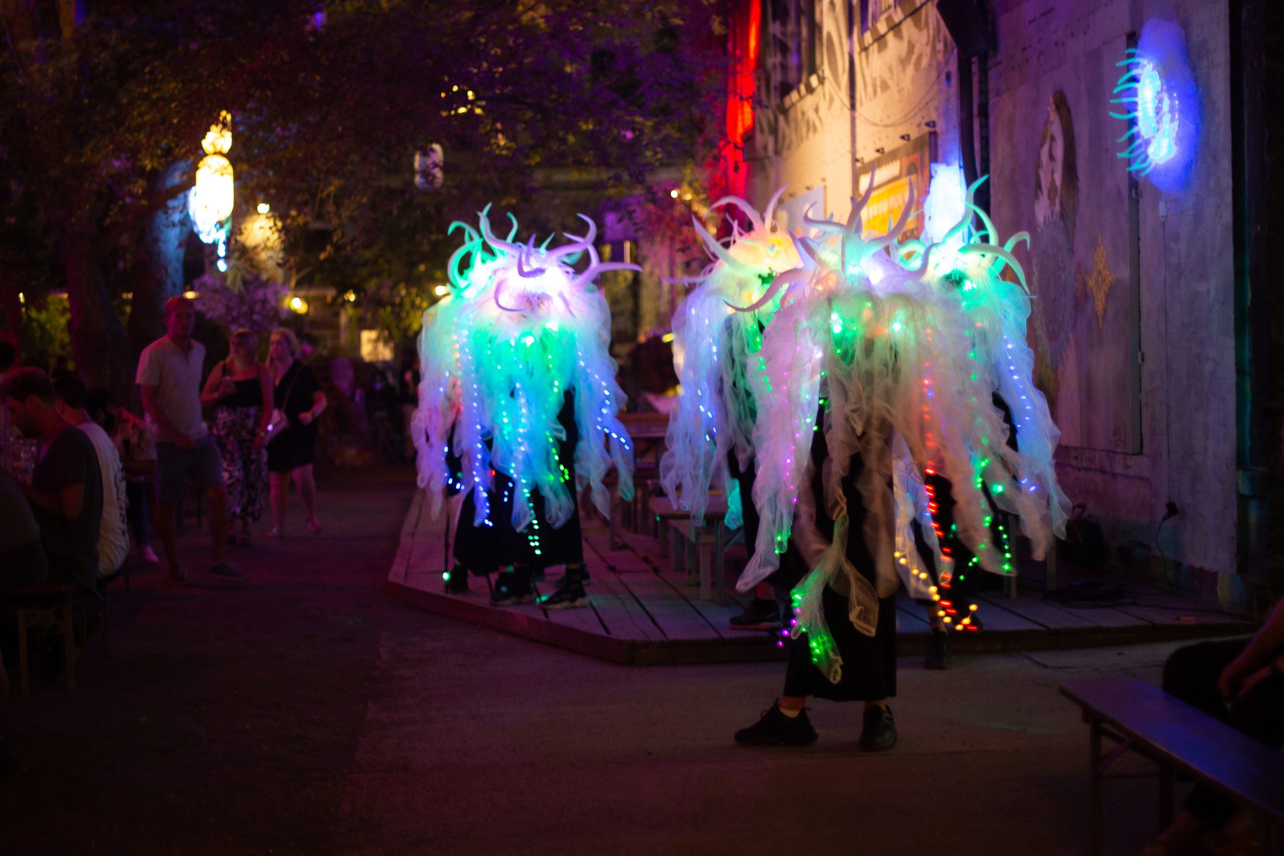 Das Krümelmonster tanzt weiterhin vor mir auf und ab, während der Sound düsterer wird. Acid-Lines mischen sich mit tiefen Kicks und die Lichter werden weiter runtergedimmt, als die Krake-Fabelwesen den Raum betreten und illuminieren. Die Aktion wirkt so herrlich unkoordiniert, kein geplanter performativer Akt, sondern schlicht Teil des Ganzen und einfach da.