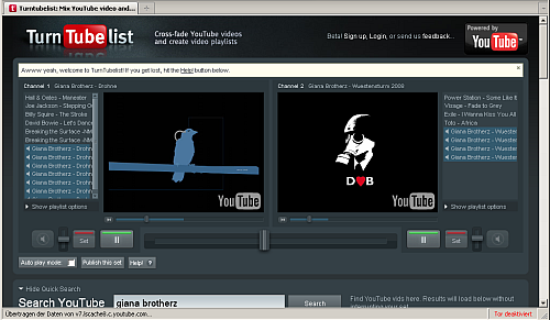 Hier hat man die Möglichkeit zwei Youtube Videos audiomäßig "on the fly" zu mixen. Finde die Idee ziemlich witzig zumal Youtube ja immer mehr als Audioquelle hernagezogen wird! Zuerst erstellt man sich eine Playliste - aus der heraus kann man dann die Videos in die Player laden und per Crossfader mixen.