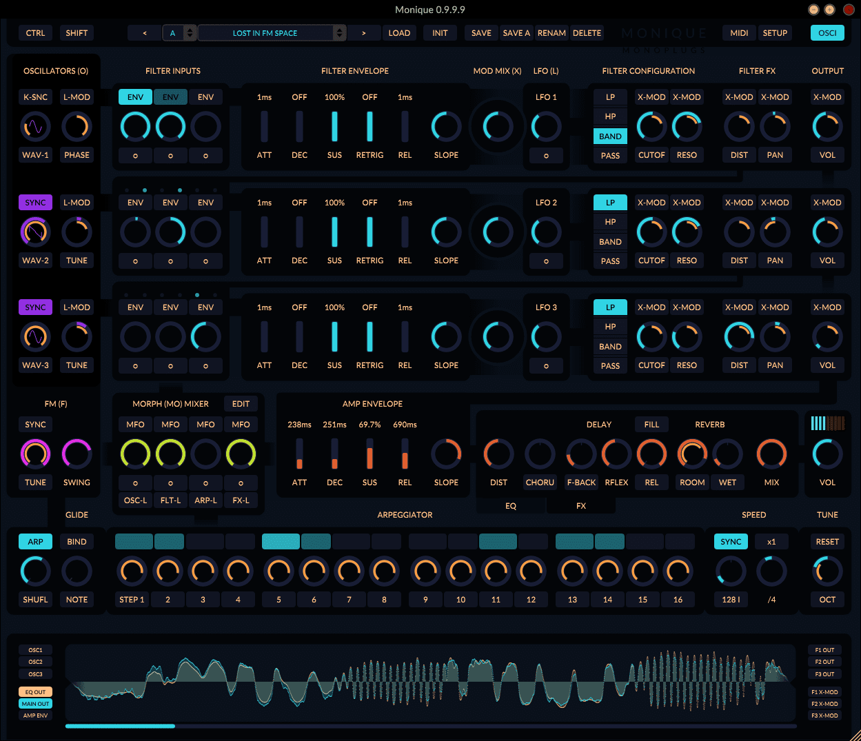 Bei Monique handelt es sich um einen subtraktiven Synthesizer, der sich nach Angaben des Herstellers besonders gut für Bass- und Lead-Sounds eignet. Er besitzt drei Oszillatoren, nebst einem zusätzlichen FM-Oszillator, drei LFOs, drei Filter, vier Effekte und einem 16-Step-Arpeggiator. Besonders an Monique ist allerdings dessen Morphing-Funktion, damit lassen sich vier Parameter eines Sounds in die gleichen Parameter eines anderen Sounds überblenden, und zwar stufenlos. Außerdem klingt Monique wirklich gut und ist trotz der vielen Funktionen relativ leicht und schnell zu bedienen. Download hier.