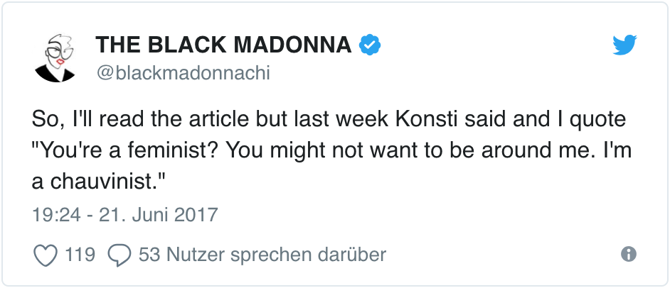 Auch die Autorin des Groove-Artikels hat sich in der Angelegenheit nun mit einem Facebook-Post zu Wort gemeldet. In diesem erklärt sie die Schwierigkeiten einer weiblichen Journalistin in einer von Männern dominierten Branche und ihre Beweggründe, die Aussagen Konstantins trotz Aussicht auf Diskreditierung nicht zu verschweigen. Sie schätze die Entschuldigung des Künstlers und hoffe nun auf wirkliche Veränderungen: