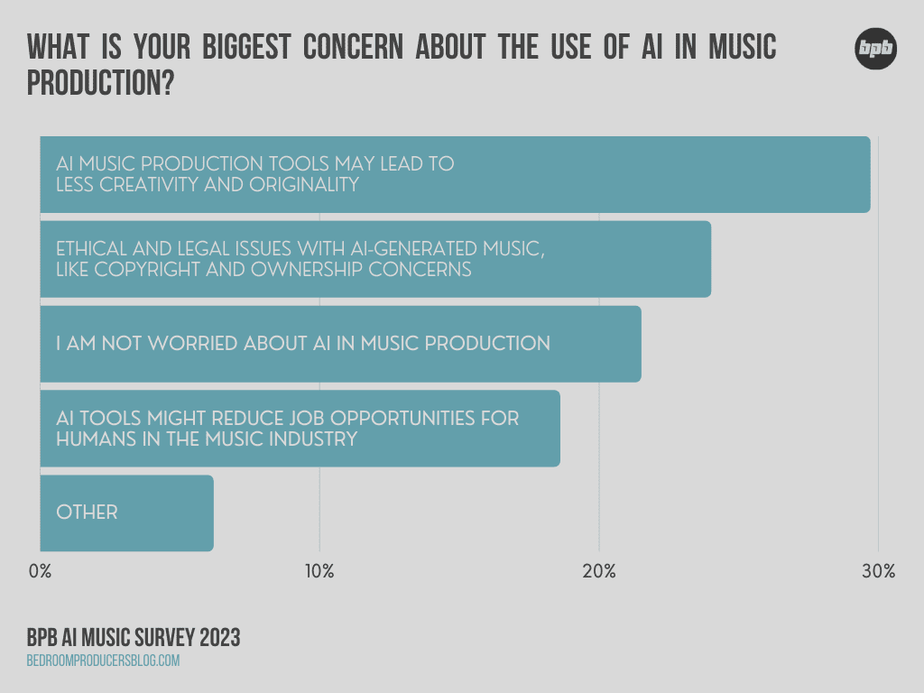 Bei der ersten Frage wollten die Fragesteller:innen wissen, wie die allgemeine Meinung zu KI bei der Musikproduktion ist. Demnach denken nur 17,3 Prozent der Befragten "negativ" über KI, während 34,8 Prozent positiv und fast die Hälfte (47,9 Prozent) neutral eingestellt sind. Auf die Frage, welche Bedenken es bezüglich KI gebe, sehen einige einen möglichen Abfall von Kreativität und Originalität (29,7 Prozent) sowie ethische und rechtliche Probleme (24 Prozent). 18,6 Prozent gehen davon aus, dass es zu Jobverlusten kommen wird.