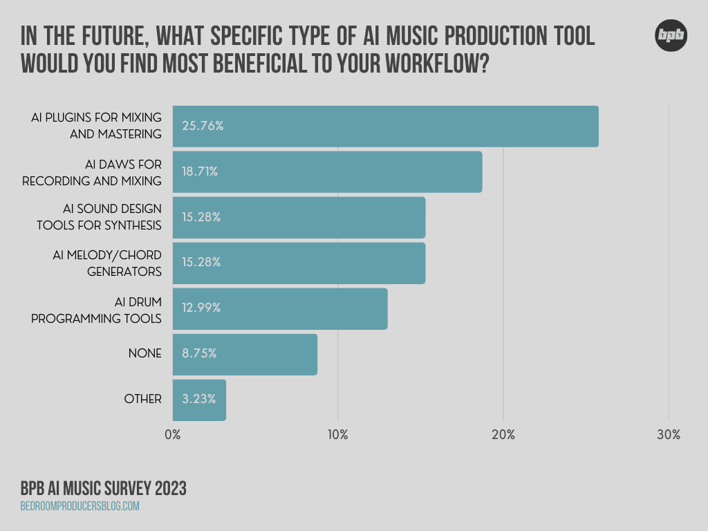 In Zukunft sehen die meisten ebenfalls den größten Nutzen in der Unterstützung von Mixing und Mastering (26 Prozent) gefolgt von KI-gestützten DAWs für den Aufnahmeprozess. Um die 15 Prozent stimmten für KI-gestützte Klangsynthese sowie der Erzeugung von Akkordfolgen und Melodien. Es glaubt zum jetzigen Zeitpunkt allerdings nur eine Minderheit (8,5 Prozent), dass gute Songs vollständig von einer KI komponiert werden. Vielmehr dienen Musik-Generatoren als Inspirationsquelle oder Platzhalter.