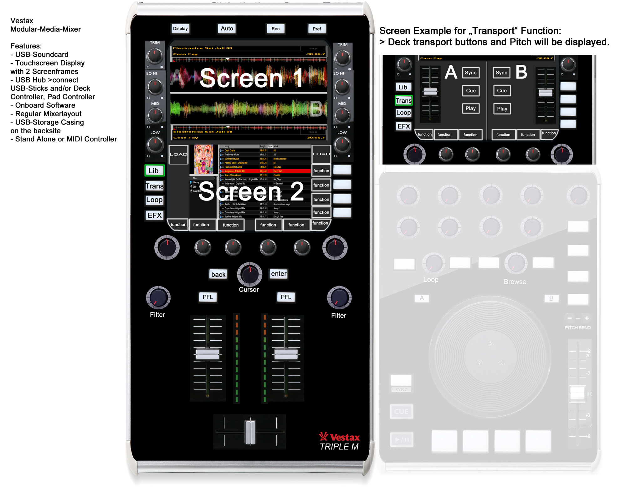Alternativ, um der Abhängigkeit von Softwarefirmen aus dem Weg zu gehen, gab es noch den nachstehenden Vorschlag zum "Triple M" (Modular Media Mixer), der sowohl als Stand-Alone Mediaplayer mit integrierter Software funktionieren sollte, als auch als MIDI-Controller mit ergänzbarem Deck-Controller oder einfach als analoger Stand-Alone-Mixer.