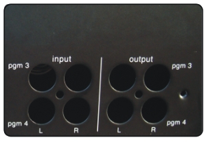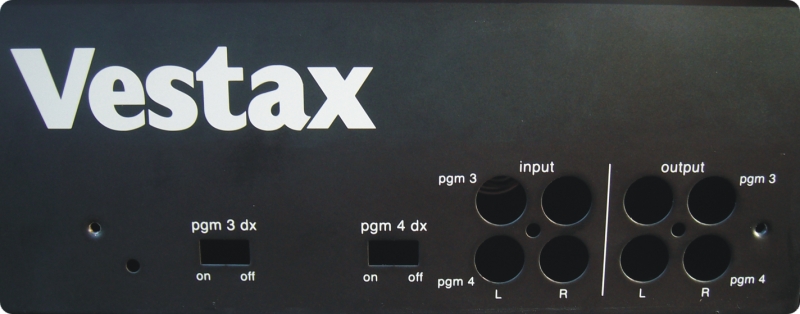 An der Frontseite findet sich ein „Option Slot“ oder zu deutsch: eine Blende, die noch unbestückte Gehäuseöffnungen verdeckt. Hier kann man das optional erhältliche DX-Panel verbauen und somit die Ein- und Ausgänge an die Vorderseite des Mixers verlegen. Bei diesem Feature wurde scheinbar an DJs gedacht, die mit digitalen Vinylsystem unterwegs sind.