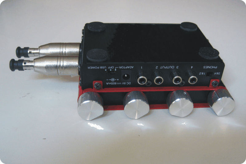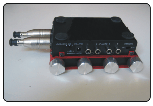 Rückseitig zeigt sich die erste Besonderheit: symmetrische XLR-Ausgänge (Output Kanal 1/2). Nicht eben typisch für ein solches Interface. Die seitlich angebrachten Regler, also dass, was aussieht wie des Panzers Ketten, entpuppen sich als Levelregler für die Ausgänge und als 2-Band Klangreglung. Ein EQ mit HI (15kHZ) und LOW (70Hz), -16dB~16dB. Im Prinzip eine gute Idee, allerdings ist der Zugewinn eine mögliche Stolperfalle. Einmal aus Versehen den Knopf bewegt, weg ist der Bass oder die Höhen. Ein denkbares, wenn auch etwas konstruiertes Szenarion, was aber nicht ungenannt bleiben sollte. Der Pegel eines jeden Kanals wird über LEDs auf der Geräteoberseite visualisiert. Dabei ist die Singnalquelle zwischen Ein- und Ausgangssignal umschaltbar. Mit dem Rechner verbunden wird VAI80 via USB, die Stromversorgung kommt von ebenda oder von einem Netzteil, was aber nicht im Lieferumfang ist.