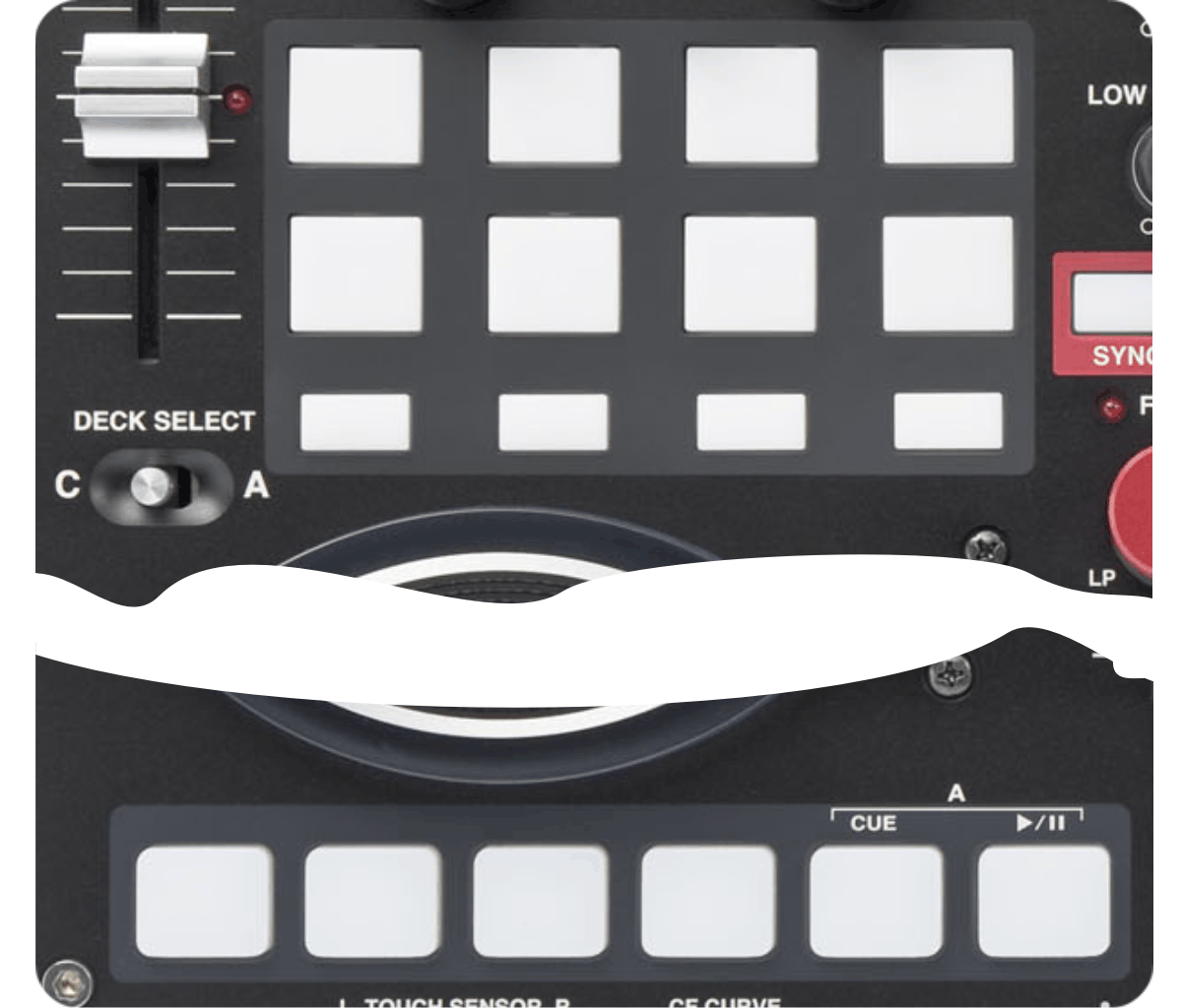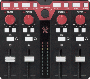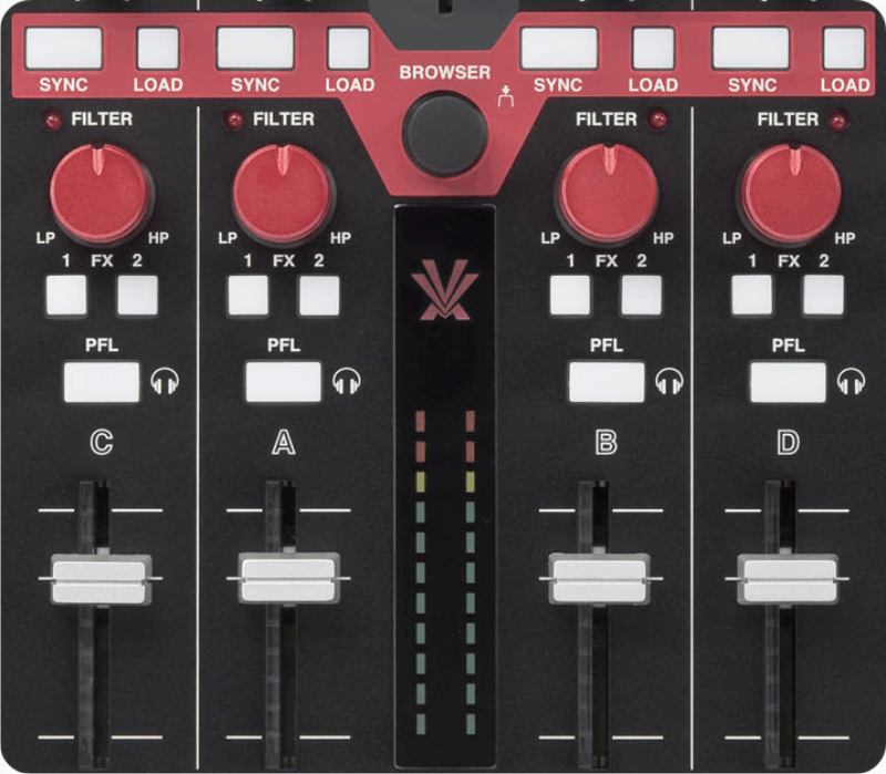 Der Mixerbereich besitzt vier vollwertige Kanalzüge (Achtung: es ist KEIN Standalone Mixer; die Aussage gilt nur den verbauten Steuerelementen!) mit jeweils einem großen und farblich abgesetzten Filter-Knob. Auch die Load- und Sync-Buttons pro Channel sind klasse platziert, da man diese ja wenn überhaupt nur einmal pro Songwechsel braucht und sie durch diese Anordnung keinen wertvollen Platz bei den Decks wegnehmen. Unterhalb des Master-Potis finden sich ein kurzer Fader und vier Buttons, die nicht beschriftet sind und sich somit bspw. perfekt für den Loop-Recorder von Traktor nutzen lassen. Neben der Master-LED Anzeige in der Mitte hat jeder Kanal auch seine eigene Aussteuerungsbeleuchtung unter dem jeweiligen Linefader, und zwar über die komplette Faderlänge.