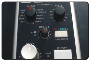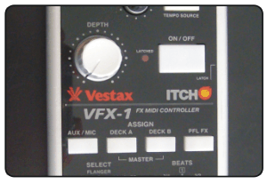 Wie schon vom VCI300 gewohnt, zeichnet sich auch der VFX durch ein schnell erfaßbares Layout aus. Die in der Software kommenden neun Effekte sind schon am "Select" Regler der Hardware abzulesen. Für Effekte, welche in weiterer Zukunft nachgereicht werden, gibt es drei Platzhalter (User). Die übersichtlichen Bedienelemente sind zweifach, also pro Deck vorhanden. Via einen, auf die On/Off Taste bezogenen und "Latch" genannten, Schalter läßt sich wählen, ob der Effekt dauerhaft zugeschalten oder getriggert werden soll.