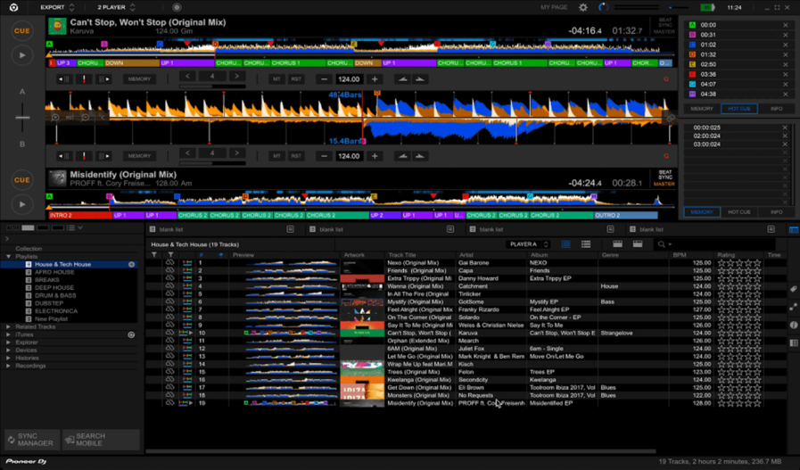 Bis zu vier virtuelle Decks stehen zur Verfügung, die auch Infos wie Zeit- und Trackverlauf, BPM, Tonart und Tonhöhe bereitstellen. Eigene Playlists können erstellt und über die Suchfunktion schnell wiedergefunden werden. Und über MIDI-Learn ist es möglich, weitere Controller ins Live-Set mit einzubinden.