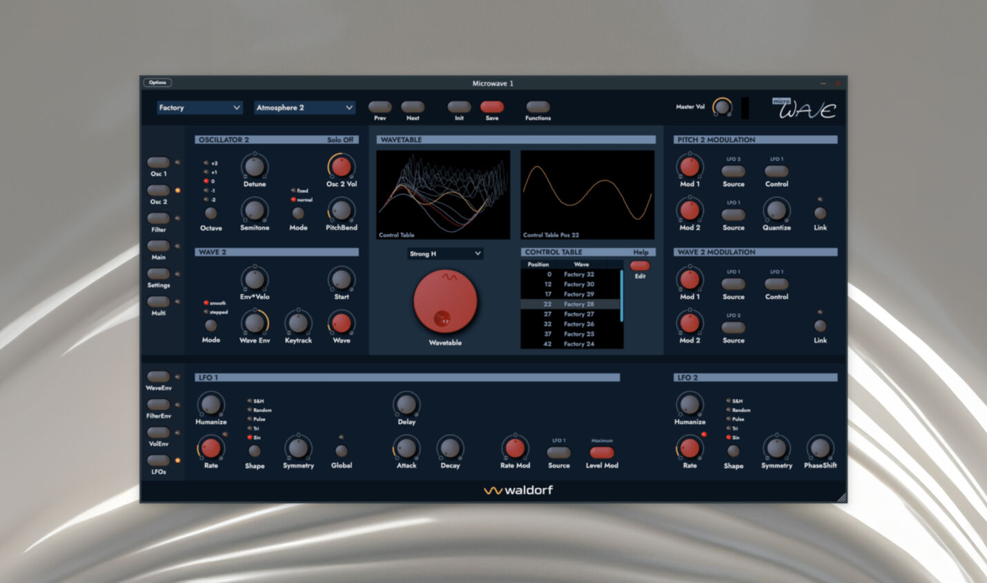 Abgesehen davon hat man natürlich die Möglichkeiten eines Plugins genutzt und die Oberfläche verändert. Sämtliche Funktionen bekommen mehr Raum und eine bessere Übersicht als beim Original. Der Multimode ist wesentlich leichter zu bedienen und natürlich gibt es innerhalb der Plugins eine grafische Darstellung der Wavetable, Filter und Hüllkurven. Das macht die Bedienung des Mircrowaves deutlich angenehmer. Zudem kann man bestehende Wavetables editieren und eigene User-Waves erstellen.