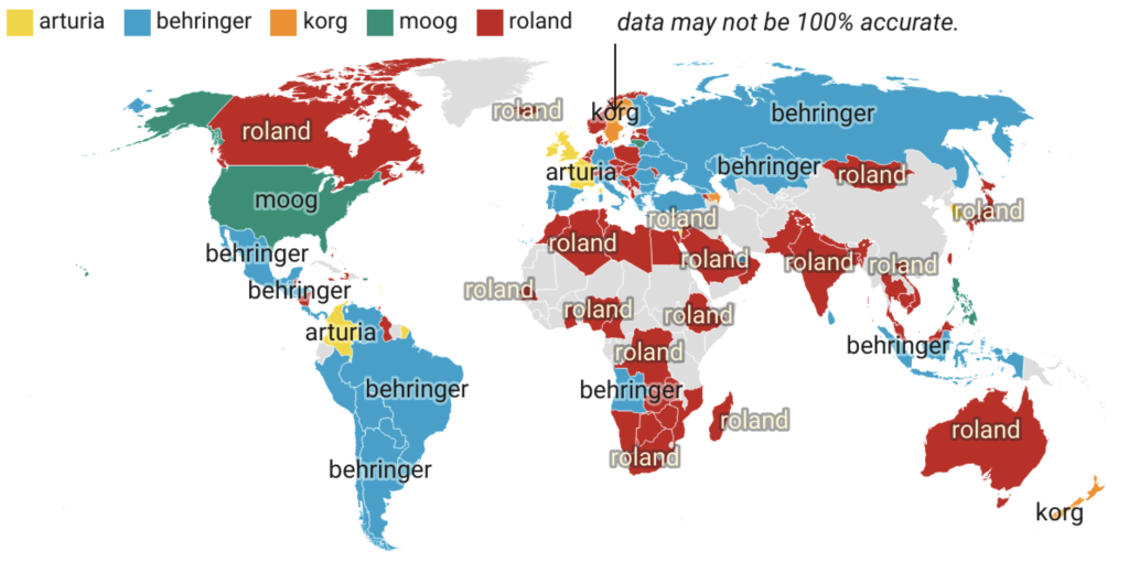 Demnach haben in Behringer in Deutschland, Roland in Japan, Arturia in Frankreich und Moog in den Vereinigten Staaten die höchste Beliebtheit. Damit wurden stets die heimischen Marken am häufigsten bei Google gesucht. In Deutschland gab es in einem Monat 8.100 Suchen zu Behringer, 6.600 zu Roland, 5.400 zu Arturia, 5.400 zu Korg, 4.400 zu Moog und 390 zu Oberheim.