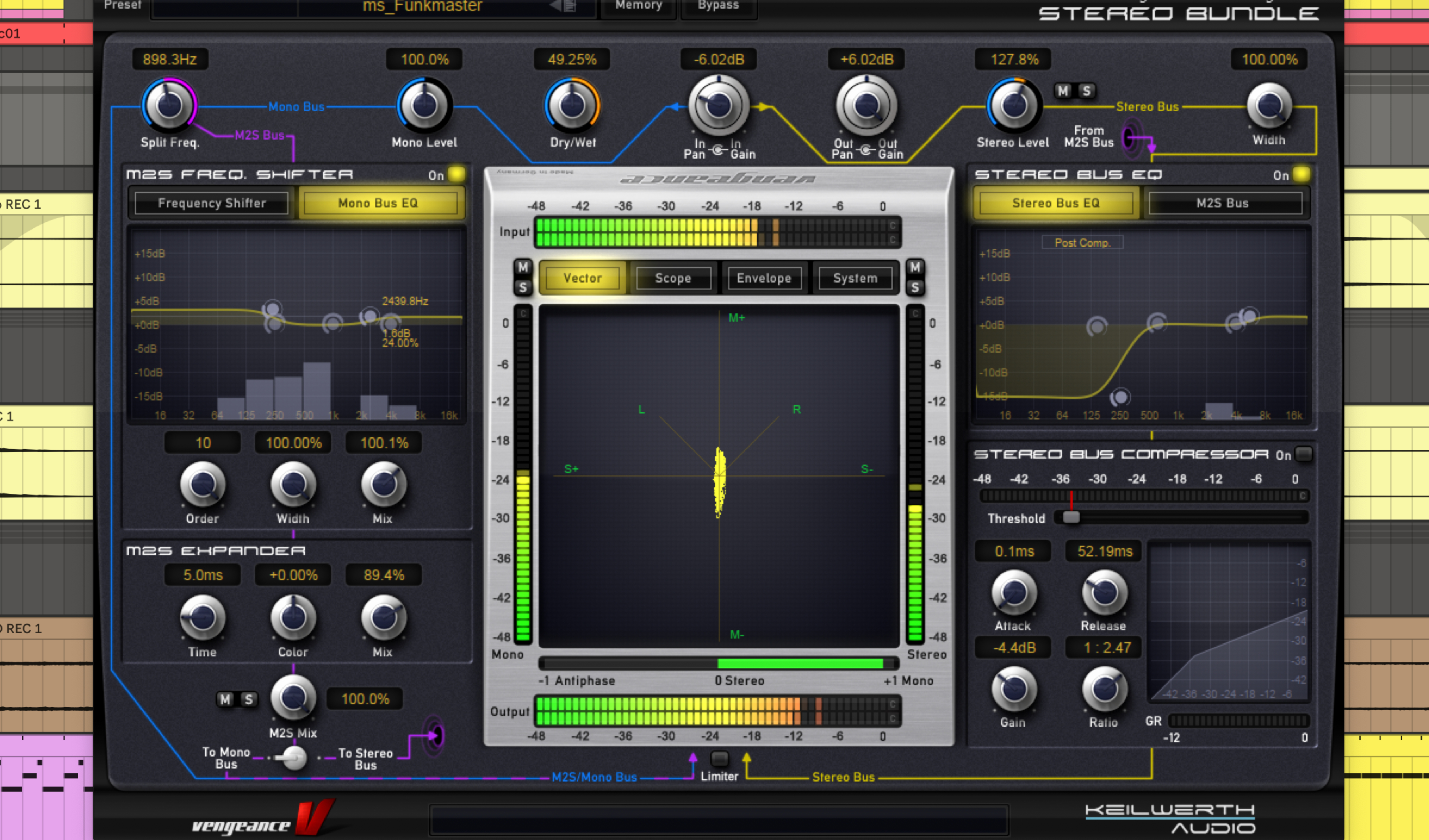 Das Preset sollte natürlich zu den Sound-Eigenschaften des Kanals passen, also ein Overhead-, Hihat-Preset für die Tops und Bass Patches für den unteren Frequenzbereich. Die Gruppen komprimiere ich leicht an mit einer Ratio zwischen 2 bis 3 und einer Threshold-Einstellung bis zu einer maximalen Reduktion von zirka zwei Dezibel. Diesen Wert zeigt die Ausschlagsanzeige (VU-Meter) in eigentlich jedem guten Kompressor (-Plugin). Starke Kompressionen und Sidechain Routings sollten in der Soundfindungsphase erledigt worden sein. Als Special FX setze ich gerne Stereoverbreiterungs-Plugins wie zum Beispiel das Vengeance VMS Stereobundle auf die Overhead und Mitten/Synthesizer/FX Gruppe. Diesen Effekt bitte vorsichtig behandeln und die Korrelationsgradanzeige im Auge behalten, die sich nur in dem Bereich von +1 (mono) und 0 (100 % Stereo) aufhalten darf. Den Bassanteil der Kickdrum, der Bassline und anderer Instrumente, die sich in diesen Bereichen aufhalten (Rumble), solltet ihr unterhalb von zirka 150-200 Hertz Mono ziehen, um Phasenprobleme zu vermeiden. Das funktioniert sehr effektiv mit dem Ableton-eigenen Utility Tool. Hier könnt ihr die Frequenz wählen und müsst den „Bass Mono“-Schalter aktivieren.