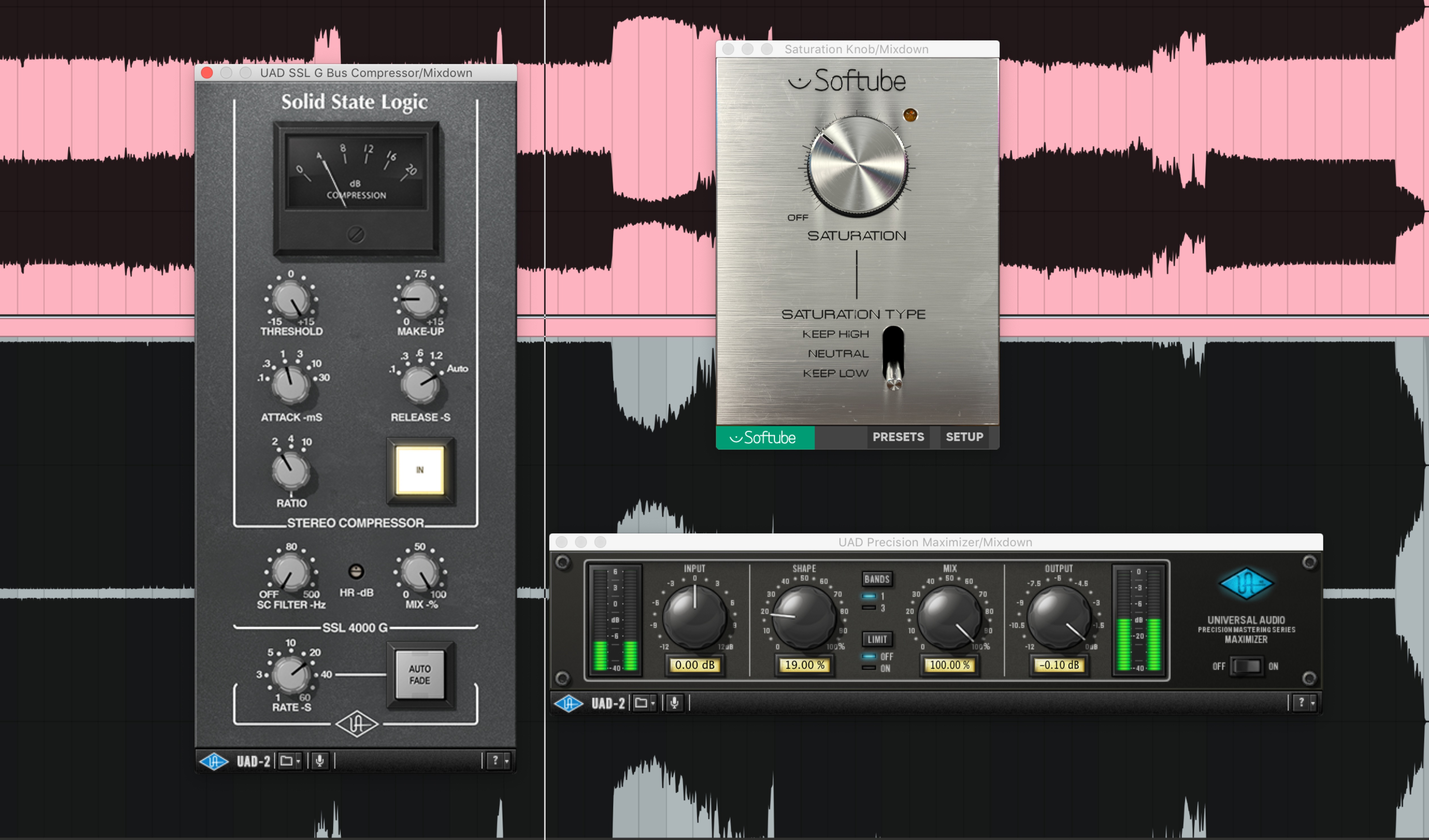 Jetzt fette ich den Sound nochmals mit einem Saturator an. Sehr gut funktioniert der Precision Maximizer von UAudio (UAD) oder der kostenlose Saturation Knob von Softube. Mit maximal 20-30 Prozent zusätzlicher Saturation komme ich meinem gewünschten Sound meistens sehr nahe. Dieser Schritt „verklebt“ nochmals alle Instrumente, Effekte und die Drum-Sektion im Song. Jetzt sollte es einheitlich klingen.
